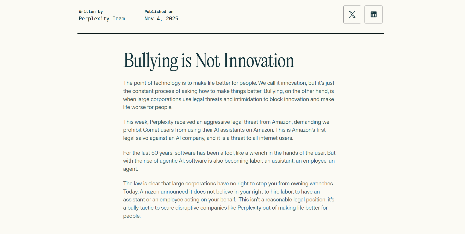 面对亚马逊的“逐客令”,Perplexity也在第一时间发布了题为《霸凌不是创新》的公开信。